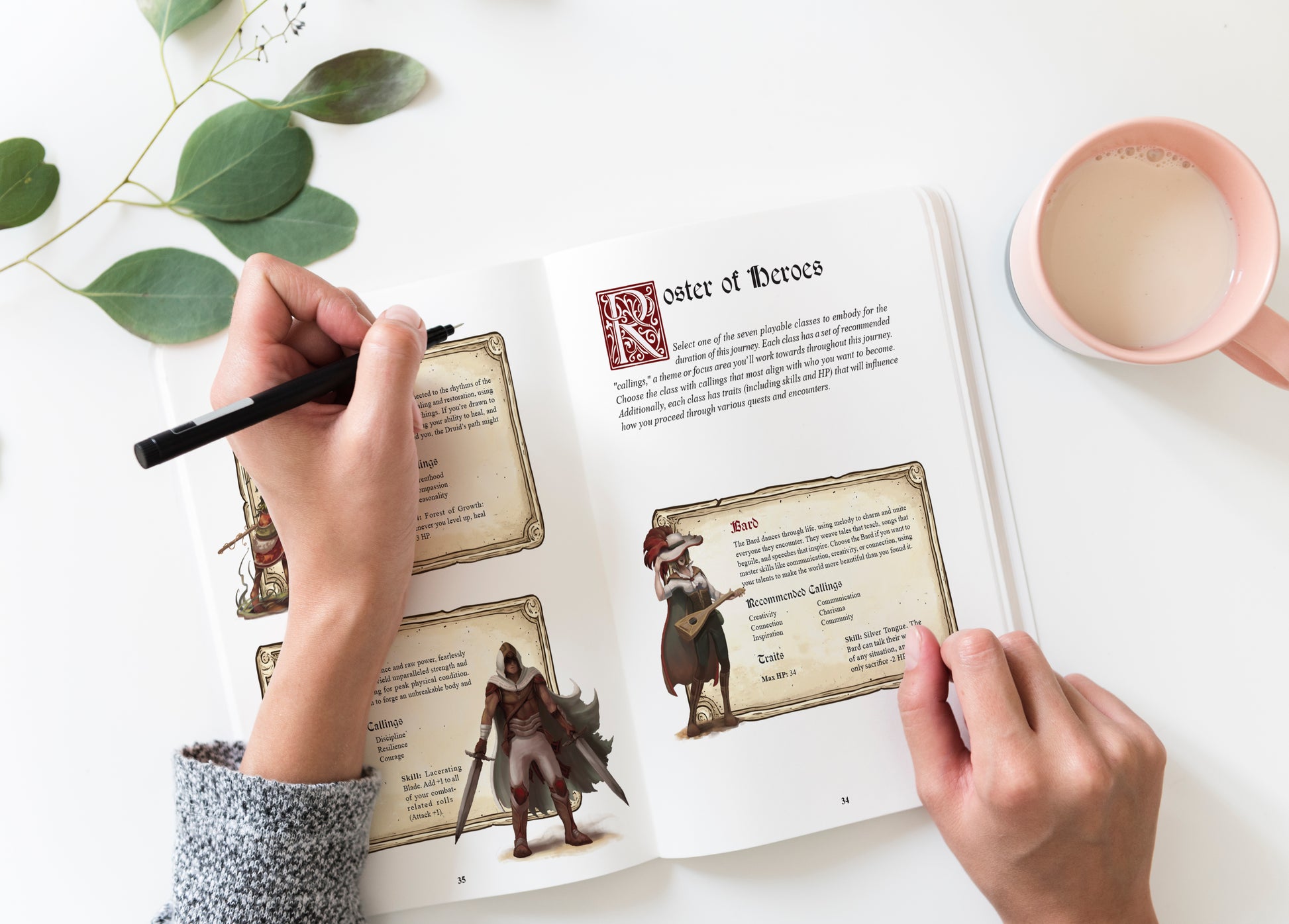 Choose from one of seven unique characters, each with special abilities and traits. The character you choose dictates what area of your life you’ll focus on improving (your “calling”), and which science-based tools (“spells”) you’ll need to master in order to complete the journal.